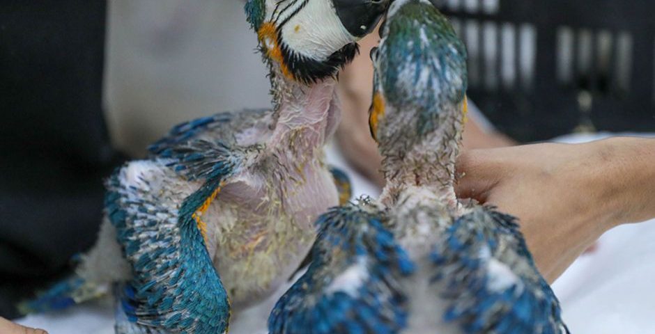 Filhotes de ararinha vítimas de maus-tratos passam por reabilitação no DF