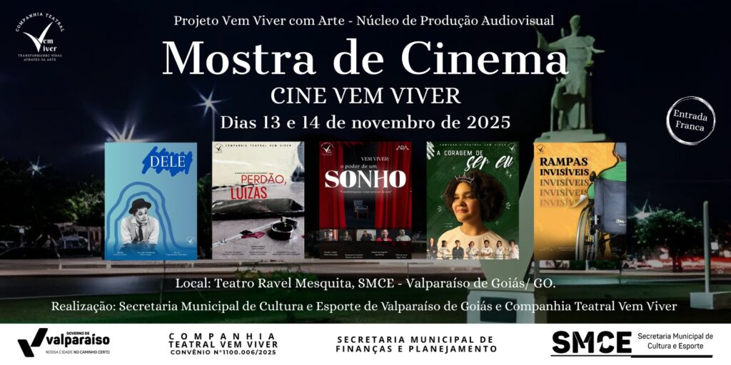 Nos dias 13 e 14 de novembro de 2025, o município de Valparaíso de Goiás sediará mais uma edição da Mostra de Cinema – Cine Vem Viver. O evento ocorrerá no Teatro Ravel Mesquita, localizado na sede da Secretaria Municipal de Cultura e Esporte (SMCE), e contará com sessões de exibição às 9h30, 15h e 20h. A entrada será gratuita e aberta à comunidade.